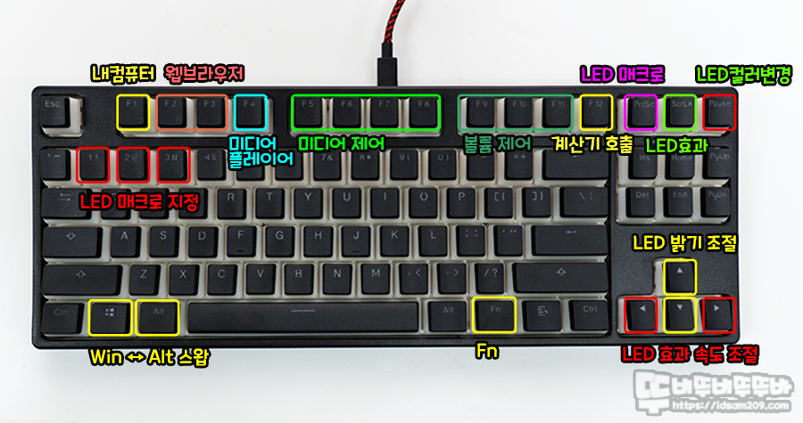 DIY 제품이다 보니 제품의 기능이 각인된 키캡이 없는 상황으로 사용자가 기능을 숙지해야 하는 불편함이 있는데요.