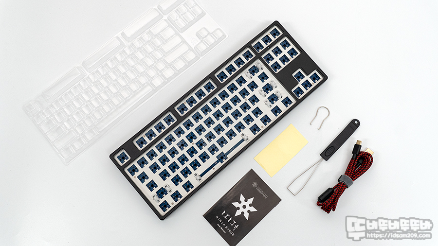 제품은 투명 블리스터 커버, 닌자87 RGB 퀵스왑 DIY 본체, 사용 설명서, 패키지 밀봉용 원형 데드롱 스티커, 키캡 리무버, 스위치 리무버, USB-C to A 케이블로 구성되어 있습니다.
