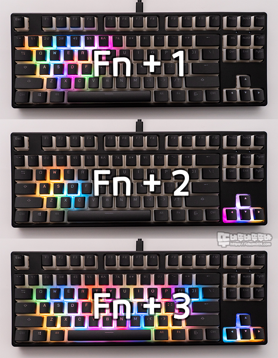 Fn + 1~3번에 기본으로 저장된 LED 점등 모습인데요. 여기에 LED 매크로 적용이 가능합니다.