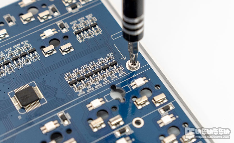 먼저 보강판 뒷면에 실리콘 차음재를 올려주고 기판을 뒤집어 분해 역순으로 왼쪽 부분에 나사를 채결해 줍니다.