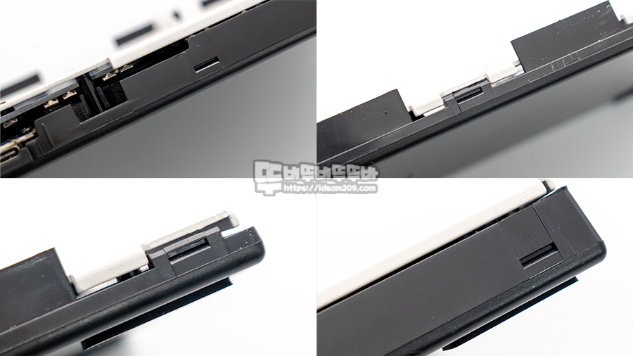 초심자들에게 조금 어려울 수 있는 키보드 상판 분리는 하판 위/아랫부분에 안 쓰는 신용카드나 하우징 분리 툴을 이용하여 상판과 하판 사이 경계면에 틈을 만들어 갈고리처럼 결속된 상판을 살짝 들어 올려주면 손쉽게 분리가 가능합니다.