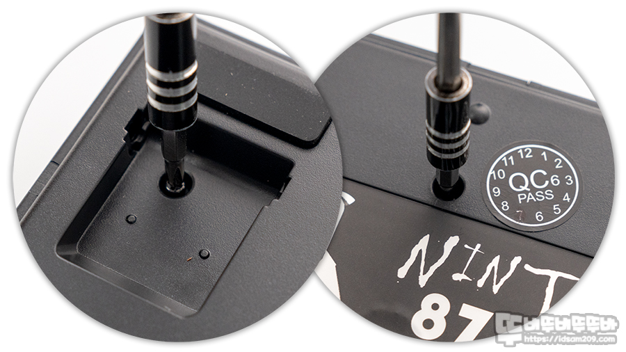 차음재를 사용하기 위해서는 하우징 분리가 필요한데 양쪽 높이 조절다리 안쪽에 보이는 나사와 키보드 중앙에 부착된 봉인 스티커 자리에 나사 총 3개의 하우징 체결 나사를 분리해야 합니다.