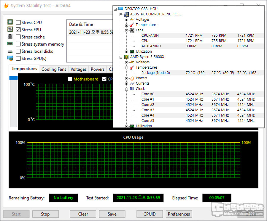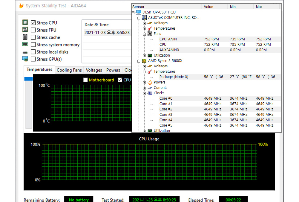 일반적인 CPU 부하로 테스트하는 Stress CPU 테스트 시 약 58도, 부동소수점까지 테스트하는 Stress FPU 테스트 시 약 72도로 안정적인 온도를 보여주었습니다.