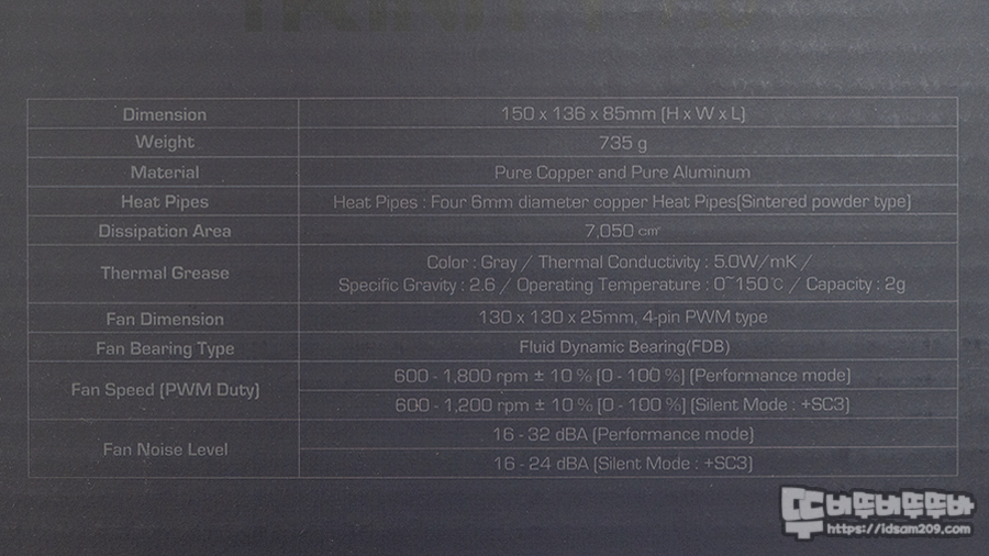 스펙 정보에 표현하고 있지 않는 정보로는 250W(TDP) 프로세서 지원, 130mm FAN을 이용하여 메인보드 VRM 회로 냉각 지원, 진동 방지용 실리콘 팬 마운트, 저소음 쿨링팬과 저항 케이블 케이블 이용 시 rpm와 소음이 줄어든다는 내용을 확인할 수 있습니다.