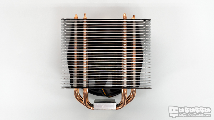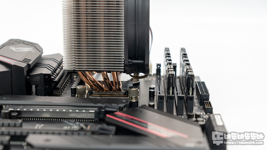 쿨러 전면의 130mm 쿨링팬은 히트 싱크보다 위/아래가 더 튀어나는 구조로 쿨링팬 아래 여분의 바람이 VRM 회로의 냉각을 지원하는데요.