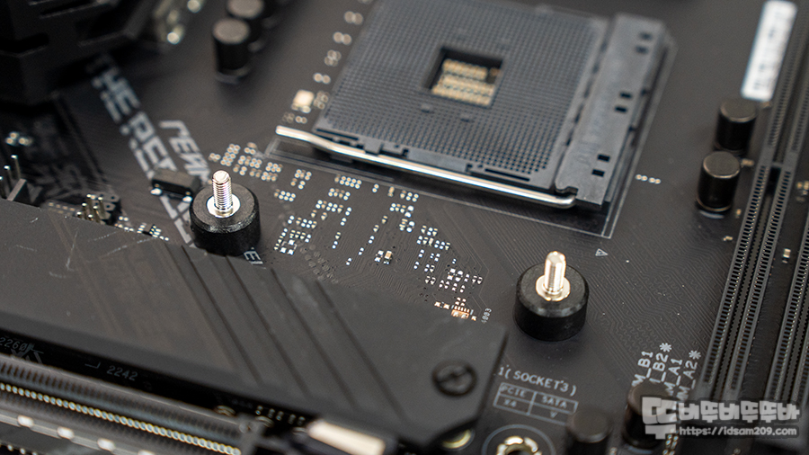이후에는 메인보드에 기본으로 장착된 가이드를 분리하고 AMD 무뽑기 방지 양단 볼트 4개를 손으로 조여줍니다.