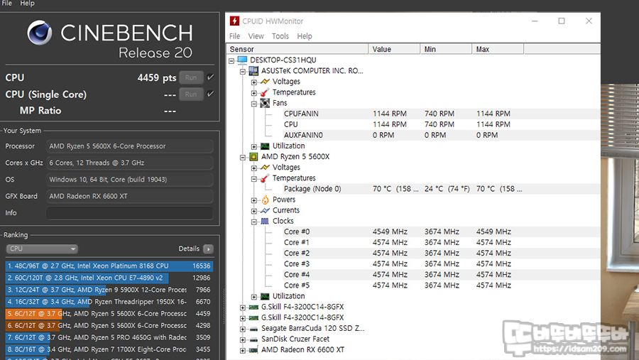 마지막으로 시네벤치의 멀티 코어 테스트 시 온도 측정을 해보니 약 70도를 유지하는 것을 확인할 수 있었네요.