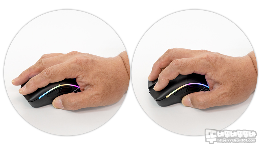 평소 마우스 전체를 감싸는 팜 그립을 사용(왼쪽) 하는 편이지만 D-는 작은 사이즈 관계로 손끝을 살짝 구부려 사용하는 클로우 그립(오른쪽)이 잘 맞는 편입니다.