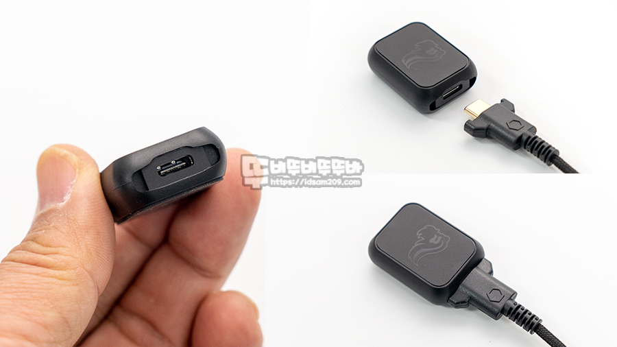 충전 및 유선 사용이 가능한 USB-C to A 케이블은 연결 시 USB-C 단자의 파손을 방지하기 위해 양쪽에 날개 모양의 고정 부가 포함되어 익스텐더 USB 허브 또는 마우스 본체에 연결 시 유격 없이 딱 고정됩니다.