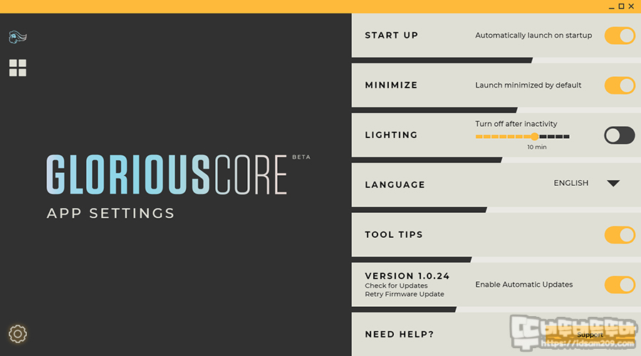 메인 화면 왼쪽 하단의 설정(톱니바퀴) 버튼을 누르면 볼 수 있는 화면에서는 Core 프로그램을 윈도우 시작 시 띄우기 설정, 최소화로 실행 설정, 일정 시간이 지나면 LED 라이팅 Off 설정 등이 가능하며 기본 영문만 지원하기에 언어 부분은 패스하시고요.