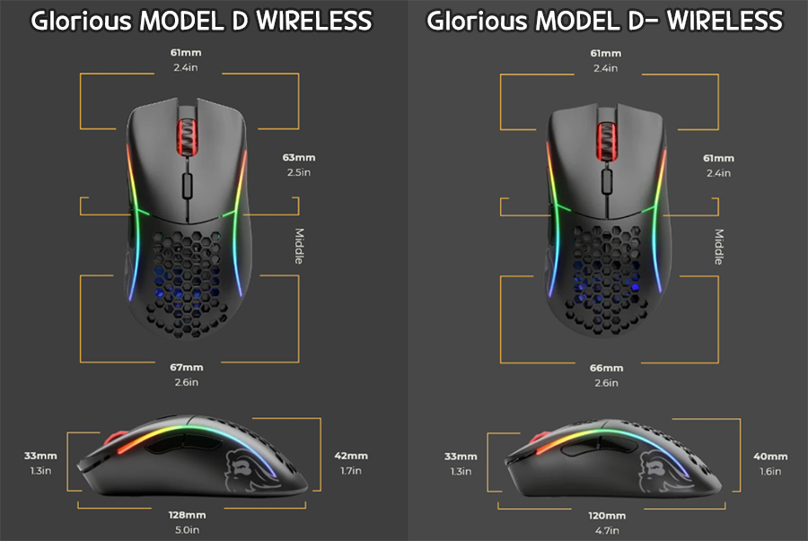 항상 마우스 리뷰에서 강조하는 부분이지만 마우스 교체는 기존에 편안하게 사용했던 마우스의 사이즈 제원과 디자인을 기준으로 비교하여 교체하시면 성공적으로 적응할 수 있으니 이전에 사용하는 마우스와 글로리어스 모델 사이즈 제원을 비교하여 D 무선 또는 D- 무선을 선택하시면 좋을 거 같습니다.