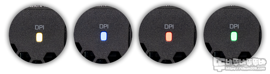 공장 출고 시 세팅된 DPI 단계는 400(옐로우) / 800(블루) / 1600(레드-기본값) / 3200(그린)으로 설정되어 있으며 코어 소프트웨어 설정을 통해 DPI 단계를 최대 6단계, 19000 DPI 및 DPI 컬러 설정이 가능합니다.