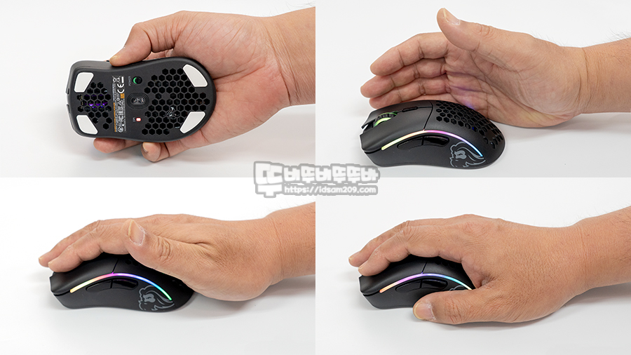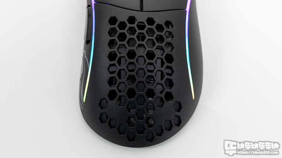 글로리어스 MODEL 시리즈는 마우스 상판과 하판 위주로 허니콤 타공이 적용되어 솔리드 형태의 하우징 사용 시 발생하는 표면 접촉으로 인한 열기가 느껴지지 않는 쾌적함을 제공하며 플라스틱 사출에 UV 코팅 처리가 된 느낌이라 필자와 같이 손이 건조한 분들은 하우징 표면이 미끄러울 수 있으니 필요에 따라 미끄럼 방지 패치를 사용하시면 좋을 거 같네요.