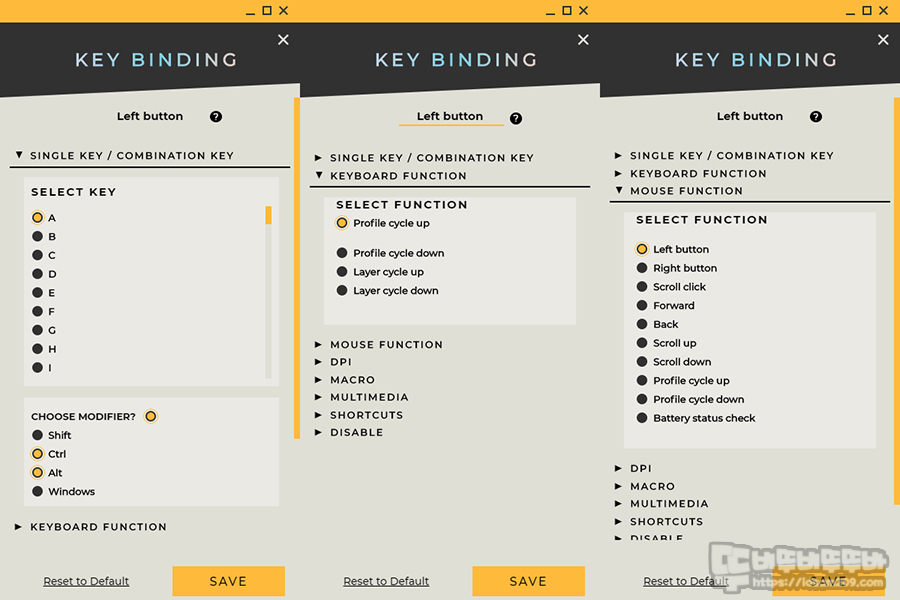 ▶ Key Binding 메뉴에서는 버튼에 부여되는 키보드 키 싱글 및 조합 기능, 프로파일 또는 레이어 사이클 외 DPI, 매크로 파일, 단축키 기능을 선택하여 부여할 수 있는데요.