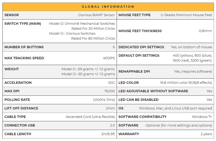 Glorious와 Pixart가 공동으로 제작한 BAMF 센서는 고성능, 저전력 소모를 최적화하는 PixArt PAW3370을 기반으로 하고 있으며 Glorious 스위치 사용, 최대 19,000 DPI 지원, 1680만 RGB 라이팅 지원 그리고 65g의 무게의 경량형 마우스로 디자인되었습니다.