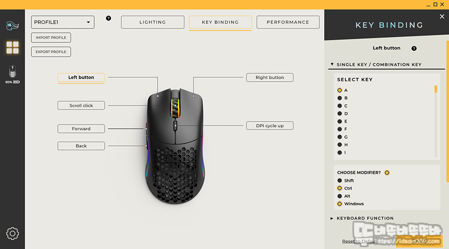 ▶ Key Binding 메뉴에서는 버튼에 부여되는 키보드 키 싱글 및 조합 기능, 프로파일 또는 레이어 사이클 외 DPI, 매크로 파일, 단축키 기능을 선택하여 부여할 수 있는데요.