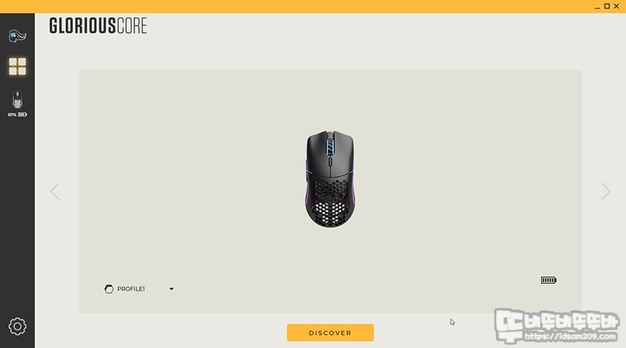 Core 프로그램에서 글로리어스 MODEL O- 무선 마우스를 인식할 경우 왼쪽 상단의 마우스 아이콘과 하단에 %로 표시되는 마우스 배터리 잔량과 우측 하단의 배터리 아이콘으로 배터리 잔량 확인이 가능합니다.