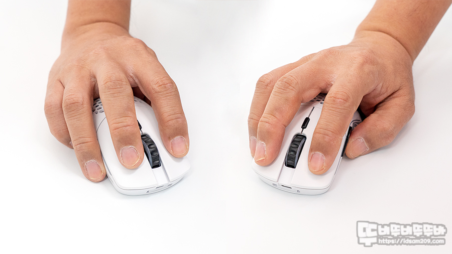 평소 마우스 전체를 감싸는 팜 그립을 사용(왼쪽) 하는 편이지만 O-는 길이와 높이가 낮은 관계로 손끝을 살짝 구부려 사용하는 핑거 그립(오른쪽) 그립이 잘 맞는 편입니다.
