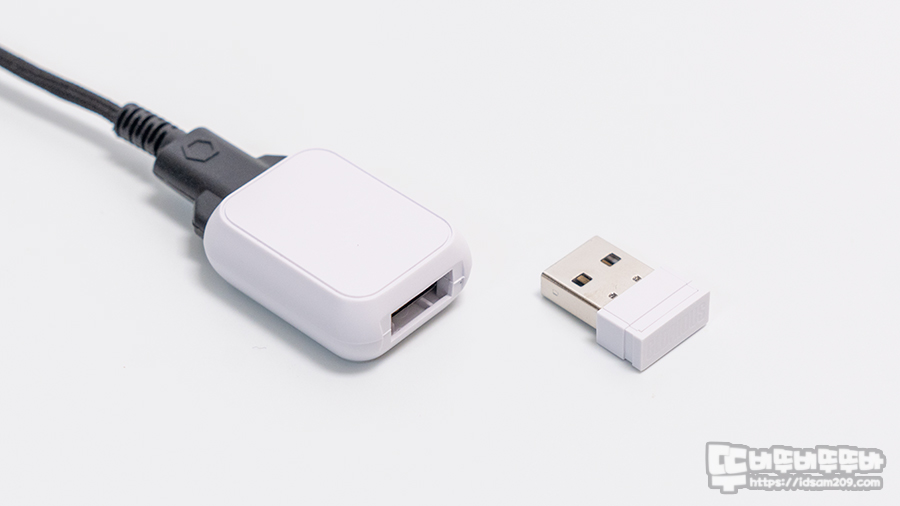 충전 및 유선 사용이 가능한 USB-C to A 케이블은 연결 시 USB-C 단자의 파손을 방지하기 위해 양쪽에 날개 모양의 고정 부가 포함되어 익스텐더 USB 허브 또는 마우스 본체에 연결 시 유격 없이 딱 고정됩니다.