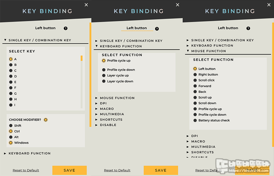 ▶ Key Binding 메뉴에서는 버튼에 부여되는 키보드 키 싱글 및 조합 기능, 프로파일 또는 레이어 사이클 외 DPI, 매크로 파일, 단축키 기능을 선택하여 부여할 수 있는데요.