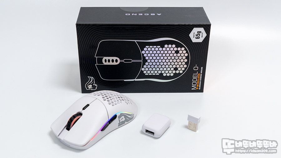 제품은 Glorious Model O- 무선 마우스 본체, USB-C to USB-A 케이블, 무선 리시버, 익스텐더 허브로 구성되어 있고요.