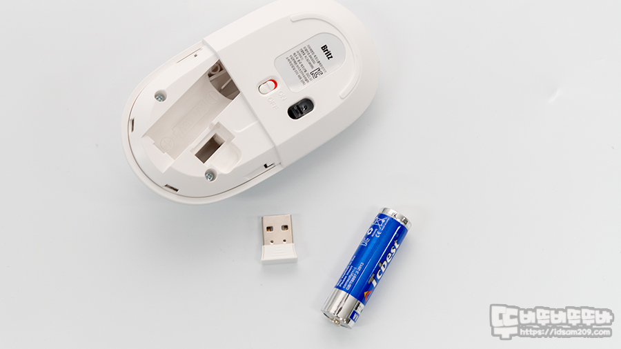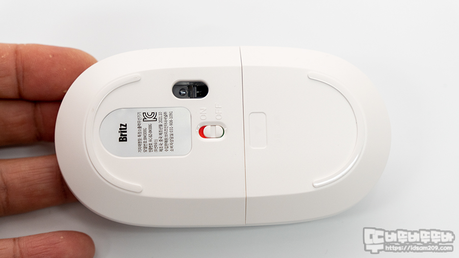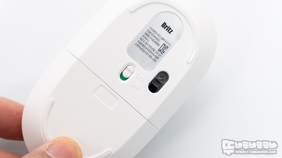 마우스 바닥면에 돌출된 플라스틱이 마우스 피트 역할을 하며 중앙에 On/Off 스위치 그리고 센서가 한쪽으로 치우쳐있는 게 특징입니다.