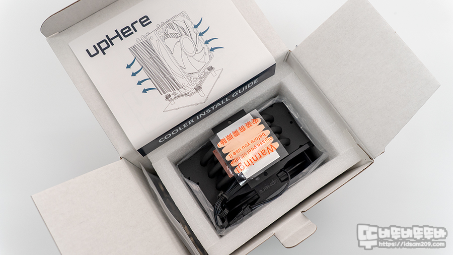 제품은 upHere N1055CF 쿨러, 사용설명서, 인텔/AMD 공용 브라켓 및 백플레이트, 추가 쿨링팬 고정 클립, 할른지예 써멀 구리스, 고정너트 & 볼트, 스프링 볼트, 스탠드 오프로 구성되어 있습니다.