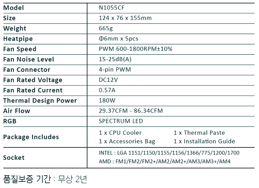 upHere N1055CF 쿨러는 DTH (Direct Touch Heatpipa) 기반의 베이스는 CPU 히트 스프레더 표면과 직접 맞닿아 CPU의 열기를 빠르게 히트파이프와 히트 싱크로 전달하는 구조로 180W TDP 프로세서를 지원하여 일반적인 인텔과 AMD 프로세서에 모두 사용이 가능하며 기본으로 제공되는 쿨러보다 안정적인 쿨링을 제공받으실 수 있습니다.