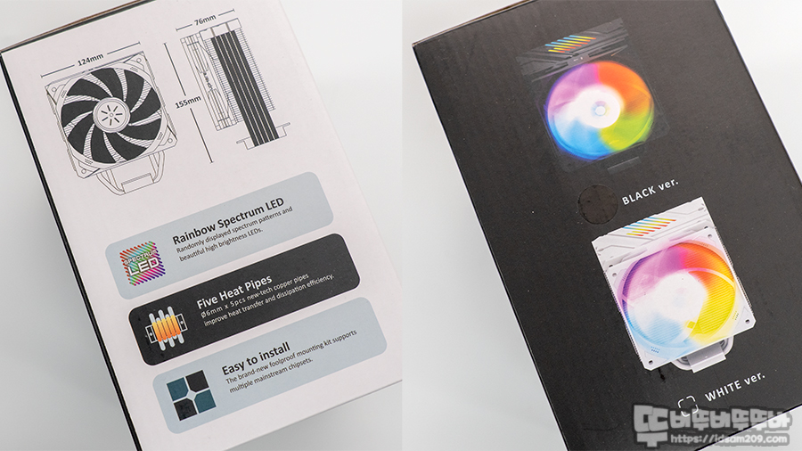 정면에 균형 잡힌 저소음 및 퍼포먼스 CPU 쿨러 그리고 인텔 12세대 지원, 스펙트럼 LED 지원에 대한 내용을 표기하고 있지만, 아쉽게도 Addressable RGB가 아닌 자동으로 변화하는 스펙트럼 효과를 지원하고 있습니다.
