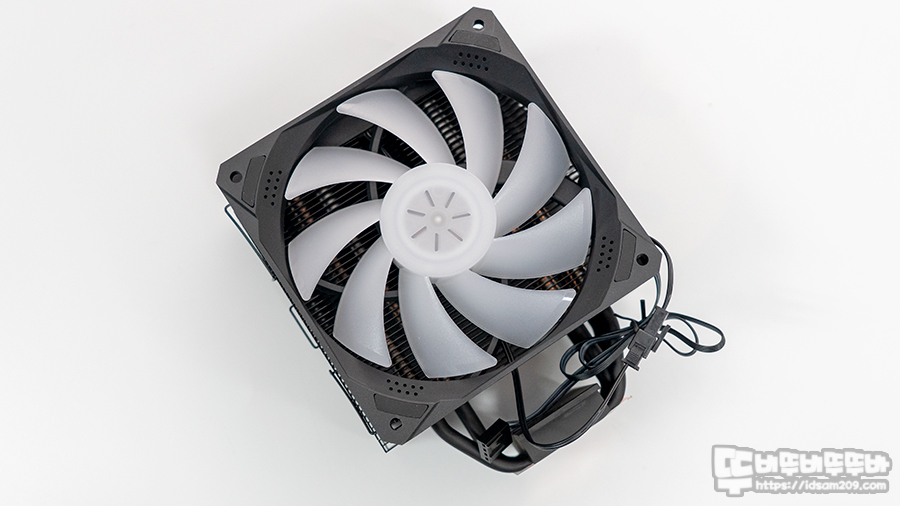 upHere N1055CF AUTO RGB (BLACK) CPU 쿨러 측면과 상단 LED 커버가 장착된 모습.
