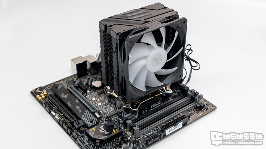 메인보드에 결합된 upHere N1055CF AUTO RGB (BLACK) CPU 쿨러 모습.