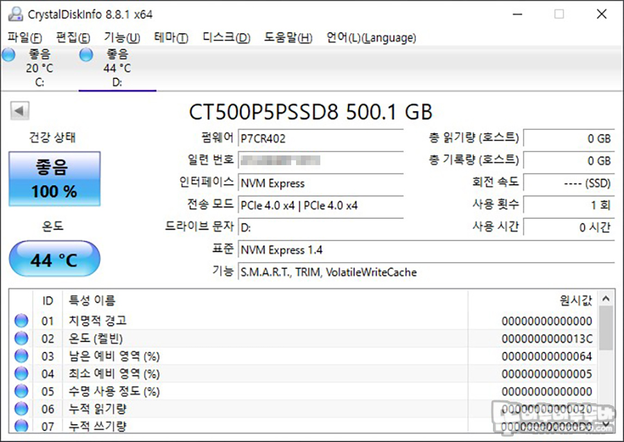 CrystalDiskInfo에서는 마이크론 Crucial P5 Plus가 PCIe 4.0 x4를 지원하는 제품 그리고 S.M.A.R.T 및 Trim 기능을 지원하는 것을 확인할 수 있습니다.