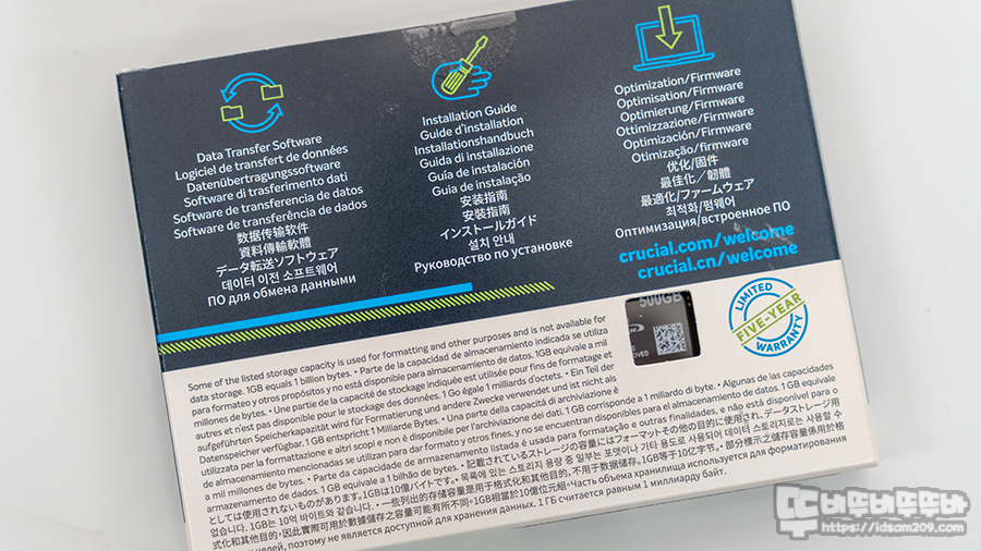 마이크론 Crucial P5 Plus M.2 NVMe 패키지에는 이전 모델과 구별이 되는 P5 Plus 이름의 공용 패키지에 유통사 대원 CTS의 정품 인증 홀로그램 스티커와 용량을 구분하고 있습니다.