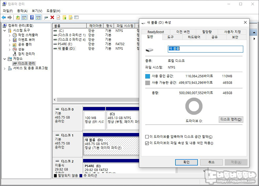 시스템 부팅 후 제어판 - 시스템 및 보안 - 관리 도구 - 컴퓨터 관리 메뉴에서 활성화되지 않은 마이크론 Crucial P5 Plus를 사용할 수 있게 활성화 후 볼륨 생성과 포맷 과정을 거쳐 D 드라이버로 선택하였습니다.