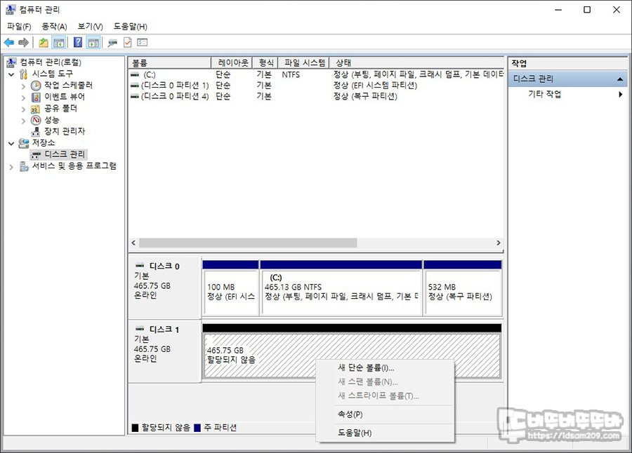시스템 부팅 후 제어판 - 시스템 및 보안 - 관리 도구 - 컴퓨터 관리 메뉴에서 활성화되지 않은 마이크론 Crucial P5 Plus를 사용할 수 있게 활성화 후 볼륨 생성과 포맷 과정을 거쳐 D 드라이버로 선택하였습니다.