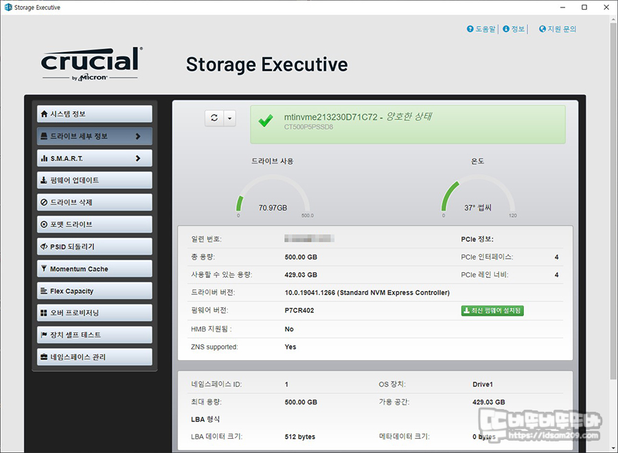 Crucial Storage Executive에서는 디스크의 사용량 컨디션, 펌웨어 업데이트, 포맷과 삭제 등이 가능하며 시스템 메모리의 일부를 캐시로 사용하는 모멘텀 캐시를 지원하는데요.