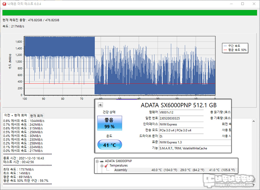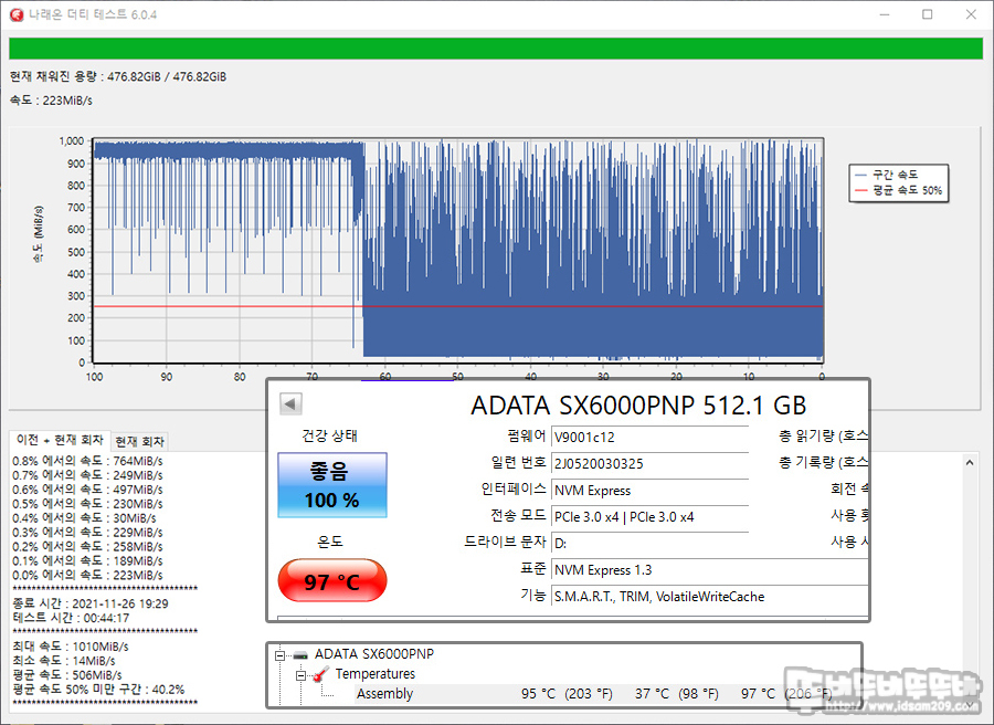 원래 테스트로 사용하는 ADATA XPG SX6000 Pro M.2 NVMe 500GB는 얇은 알루미늄 히트싱크를 부착할 수 있게 지원하는 제품이지만 이전에 빙하7 Plus 리뷰 때 히트싱크를 제거하고 나래온 더티 테스트 프로그램을 이용하여 연속쓰기 테스트 시 약 97도까지 상승하는 것을 확인할 수 있었는데요.
