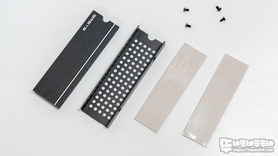 제품은 상단 방열판, 80개의 타공으로 디자인된 하단 방열판, M.2 SSD 앞뒤로 부착하는 써멀 패드 2개, 그리고 고정 나사로 구성되어 있고요.