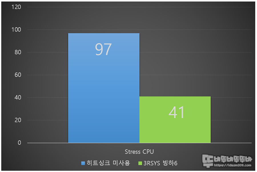 동일한 제품에 빙하6 방열판 장착 후 같은 테스트를 해보면 약 41도의 쾌적한 온도를 보여주었습니다.