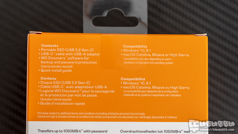USB 3.2 Gen2 지원, USB-C 케이블 및 USB-A 아답터, 최대 1,050MB/s 전송속도에 대한 설명을 확인할 수 있네요.