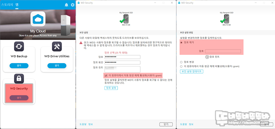 Discovery 소프트웨어를 설치 시 외장 저장 장치에 대한 관리를 지원하는 앱 (백업, 드라이브 유틸리티, 시큐리티) 설치 사용과 Discovery에서 검색되는 WD My Passport SSD의 암호 설정으로 데이터를 보호할 수 있는데요.