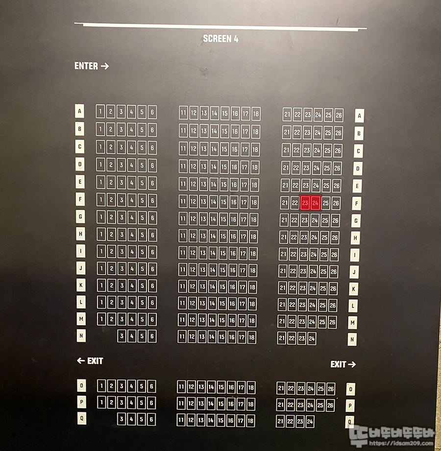 요즘은 뒤쪽이 아닌 스크린이 한눈에 꽉 차는 앞좌석을 선호하는 편인데요. F 23, 24 좌석은 우측의 사이드 좌석이지만 스크린 쏠림 없이 편안하게 볼 수 있었습니다.