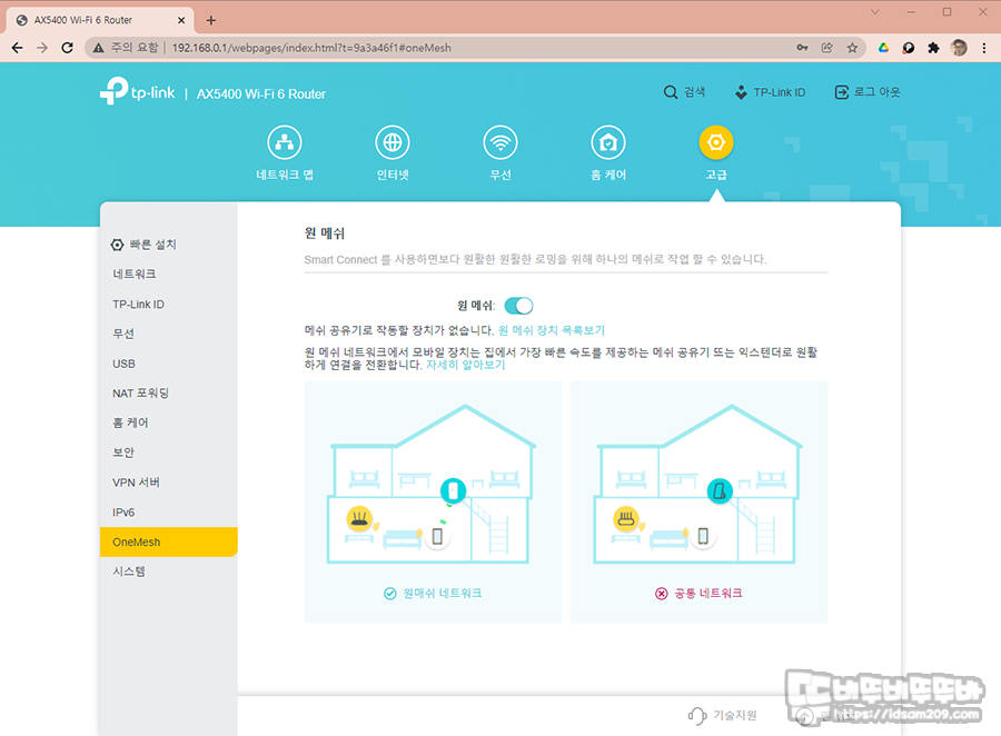 공유기 사용 시 네트워크 구성에 따라 변경해야 하는 AP 모드 지원과 원 메시 기능을 지원하니 필요에 따라 사용하시면 좋을 거 같습니다.