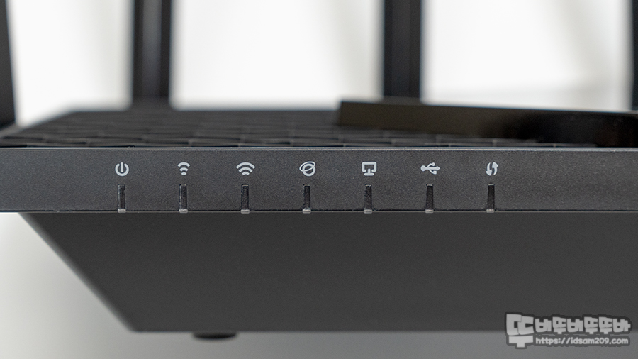가장 왼쪽부터 전면 LED On/Off, WPS, Wi-Fi On/Off, 리셋 스위치를 확인할 수 있는데 전면 LED On/Off 기능은 관리자 메뉴에서도 제어가 가능하지만 버튼 빠르게 조작할 수 있어 LED로 인한 수면방해를 해소할 수 있어서 좋았습니다.