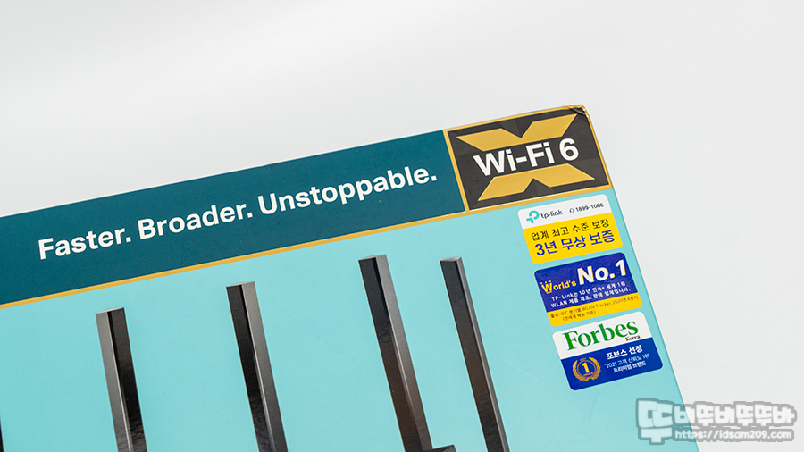 티피링크 신제품 Archer AX73 유무선 공유기 패키지에는 제품의 실물 이미지와 Wi-Fi 6 및 최대 속도 AX5400 지원, 3년 무상 지원 그리고 세계 판매 1위 제품이라는 홍보용 스티커를 확인할 수 있고요.