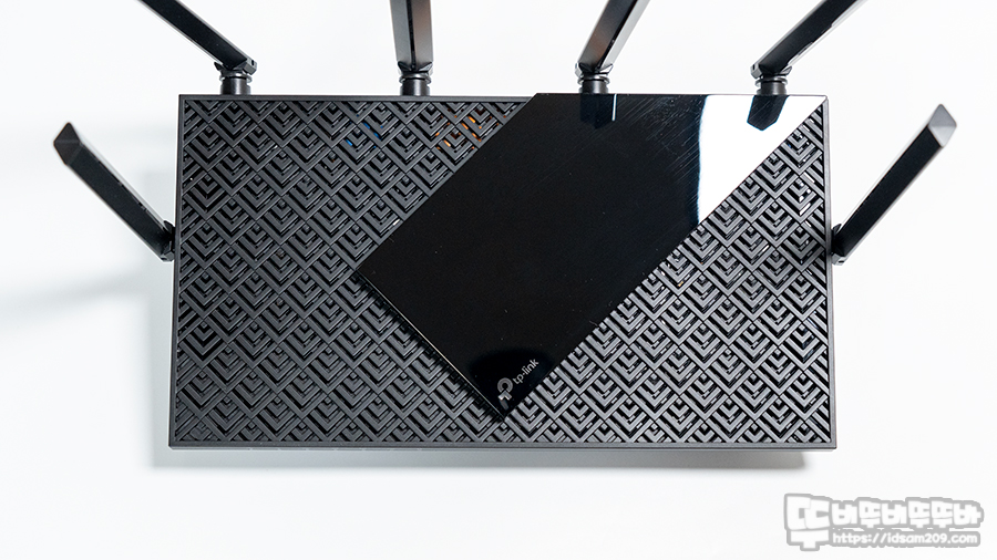 공유기 윗면에 유광 플라스틱 부분은 포인트 효과를 주는 느낌으로 고급스러움을 더하고 있습니다.