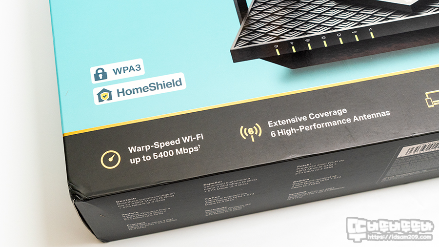 WPA3 무선 보완과 홈쉴드 지원 그리고 제품의 특징인 5400 Mbps, 6개 안테나, OFDMA+MU-MIMO, 1.5 GHz 트리플 코어 사용을 강조하고 있습니다.