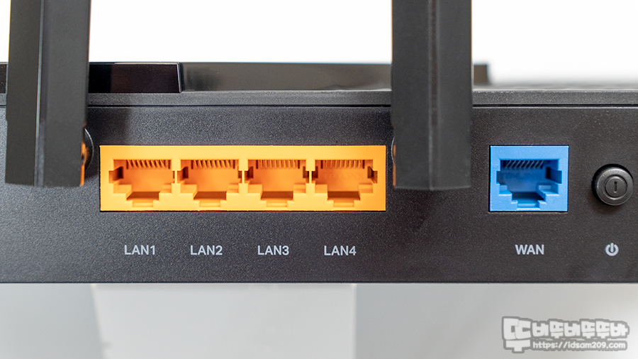 옐로우 컬러로 표현하고 있는 기가비트 랜 포트 4개와 블루 컬러로 표현되는 WAN 포트 그리고 전원 On/Off 스위치와 12V/2.5A 전원 소켓으로 구성되어 있습니다.