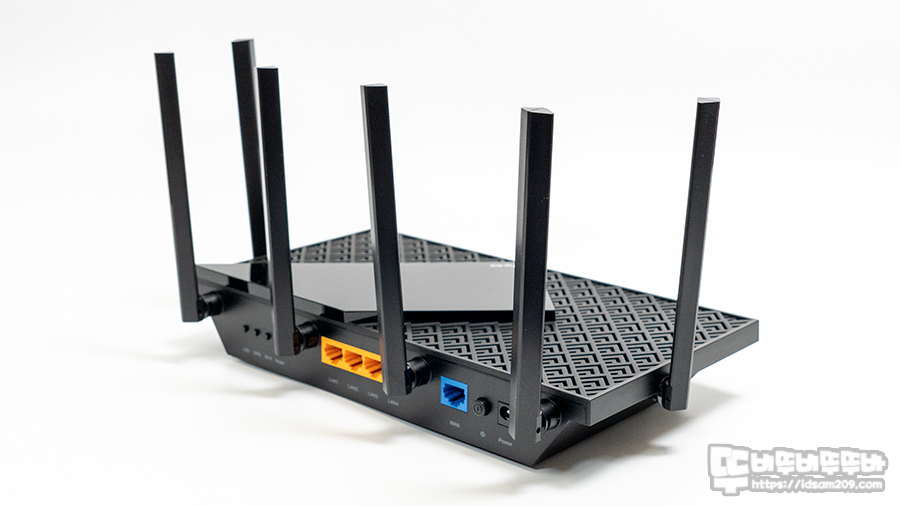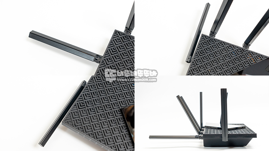 6개의 안테나는 5 GHz를 지원하는 4개와 2.4 GHz를 지원하는 2개로 구성이 되어있으며 위/아래로는 90도, 좌우로는 180도 회전이 가능하며 책상 거치 및 벽면 거치 시 다양한 각도로 안테나를 사용이 가능하고 6개의 안테나로 8K 스트리밍 지원 및 200개 이상의 무선 장치를 지원하는 OFDMA, MU-MIMO, 빔 포밍 등 안정적인 Wi-Fi 사용을 지원합니다.