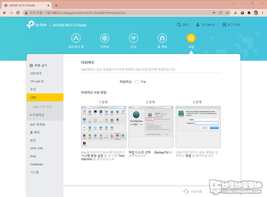 MAC을 사용하는 경우 사용이 가능한 타임머신 지원 메뉴 모습.